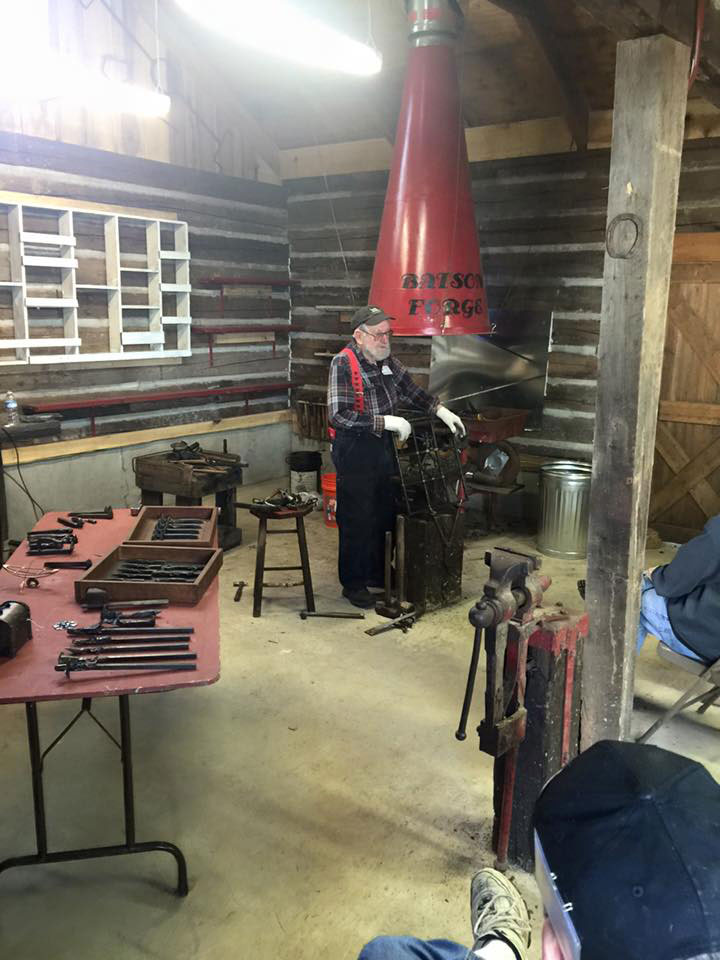 Mark Haddock and Dr. Batson - Mark learned how to forge in this shop a year after it was built at the original location 29 years ago. It is a homecoming for him to reunite with his teacher in the forge now relocated on the mountain. He is now a great blacksmith and is demonstrating colonial flowers today. Thank you Mark